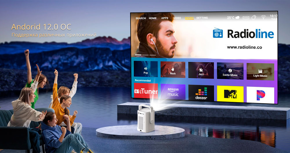 СМАРТ LED проектор (LifeStyle) • LCD x 1 • Full HD (1920 x 1080 / поддержка 4K UHD) • 900 ANSI-Lm • Контрастность 2 000 :1 • Проекционное отношение TR = 1,27 : 1 (пылезащитная закрытая оптическая система) • Диагональ изображения : 40–300″ (оптимально 55–120″) • Моторизированный Авто-фокус • HDMI, LAN (RJ45), USB A x 2, audio out • Беспроводные модули : Wi‑Fi 2,4 + 5 ГГц, Bluetooth 5.0 • Поддержка Miracast • Авто коррекция трапеции : Вертикальная V= ±45°, Горизонтальная H= ±45°, Геометрическая по 4-м углам • Шум 42 / 28 dB (eco) • Источник света: LED, ресурс 30 000 ч. / до 90 000 ч. (eco) • ОС Android 12 • Процессор : Hi-352 • Память: 1 ГБ RAM + 8 ГБ ROM • Потребляемая мощность : 80 Вт (max) • Звук 2 х 3 Вт • 135 x 120 x 200 мм • Вес 1,1 кг